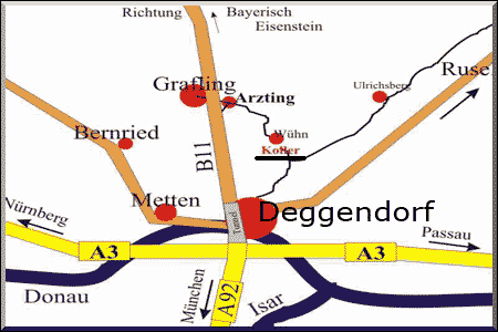Und so finden Sie uns: A3 Köln-Frankfurt-Würzburg-Nürnberg-Passau. Abfahrt Kreuz Deggendorf Richtung Deggendorf. Sie bleiben auf dem Zubringer, der in die B 11 übergeht und Richtung Eisenstein führt. Bei Grafling biegen Sie rechts ab, dann gleich wieder rechts Richtung WÜHN. Nach 2 km gelangen Sie in den Ortsteil Wühn. Nach dem Ortsausgangsschild sind wir das nächste Haus auf der linken Seite. |